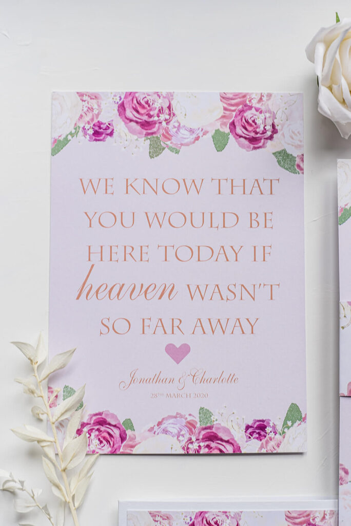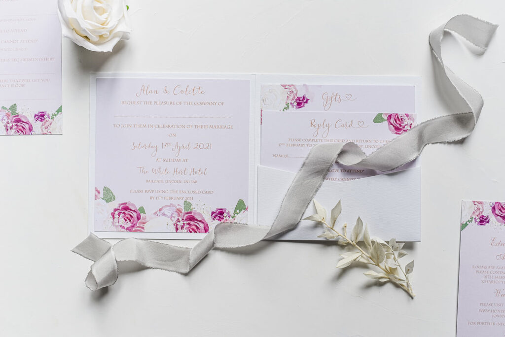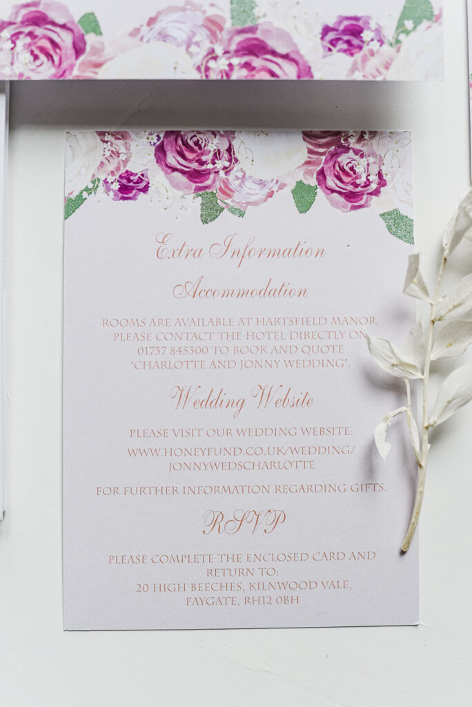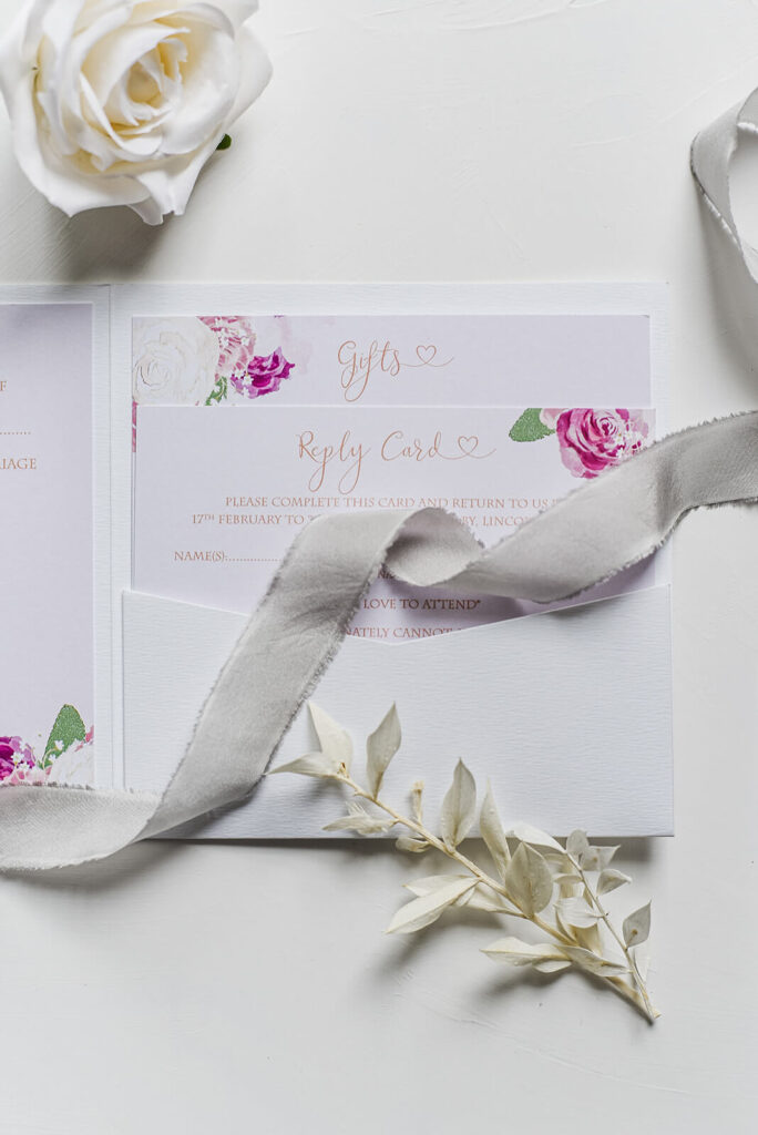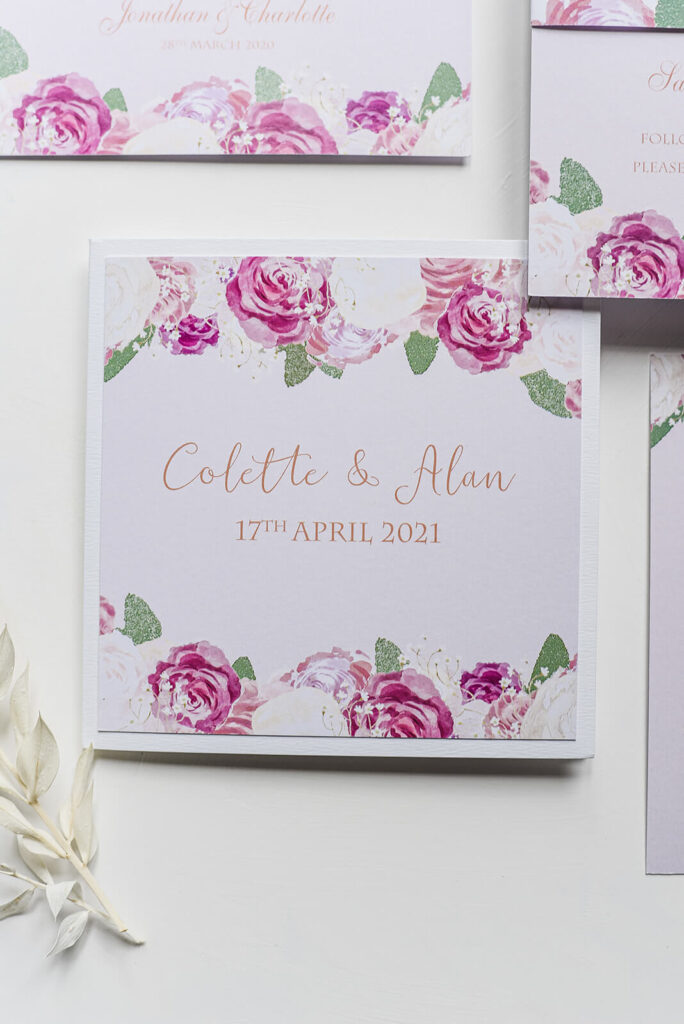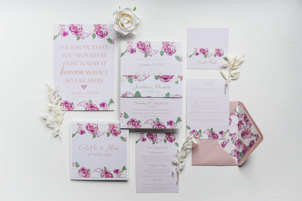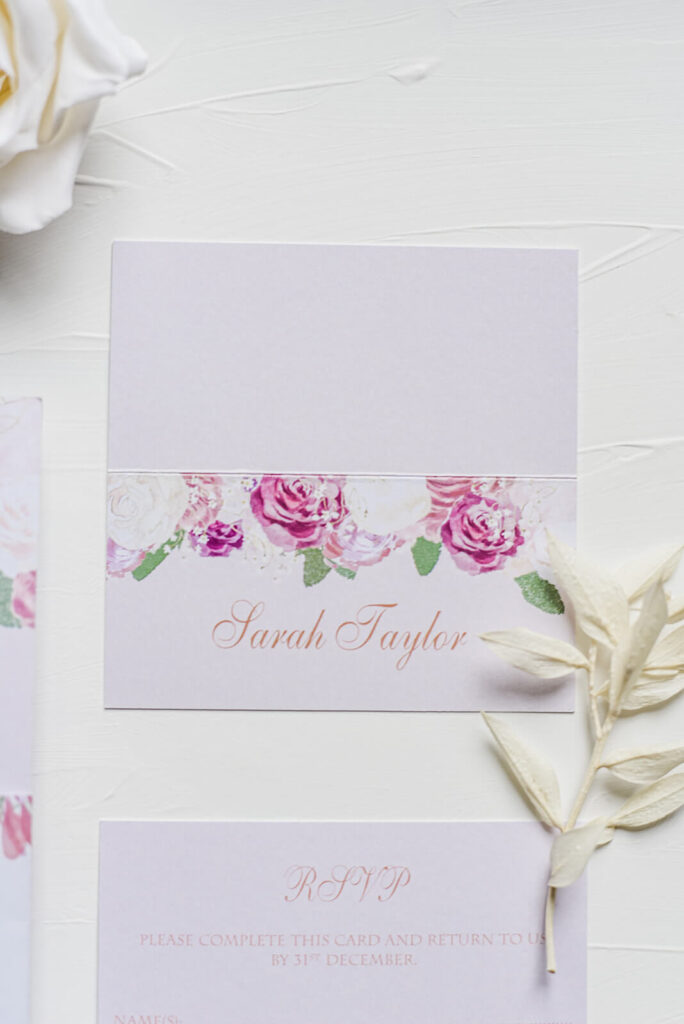The Salamanca wedding invitation is just perfect for your country garden wedding! Styled with roses and gypsophila, this design can be adapted to suit your wedding colour theme with both the florals and background being customisable. The invitation for this collection is available as either a pocketfold containing 2 inserts in the pocket inside, or a bundle of cards (one main invitation, one information panel and one RSVP) wrapped with a matching belly band. Matching on-the-day stationery is available ranging from place cards, seating plan, table numbers, menus, order of service – the list goes on! Colour changes to the printed text, florals and background print are available at no extra cost.