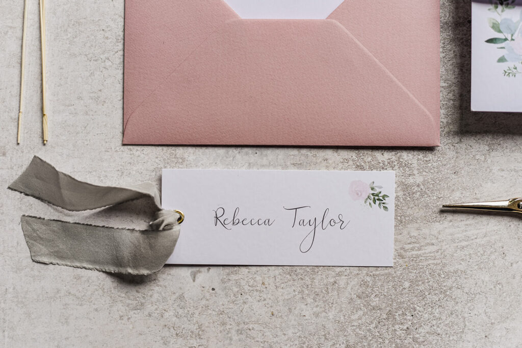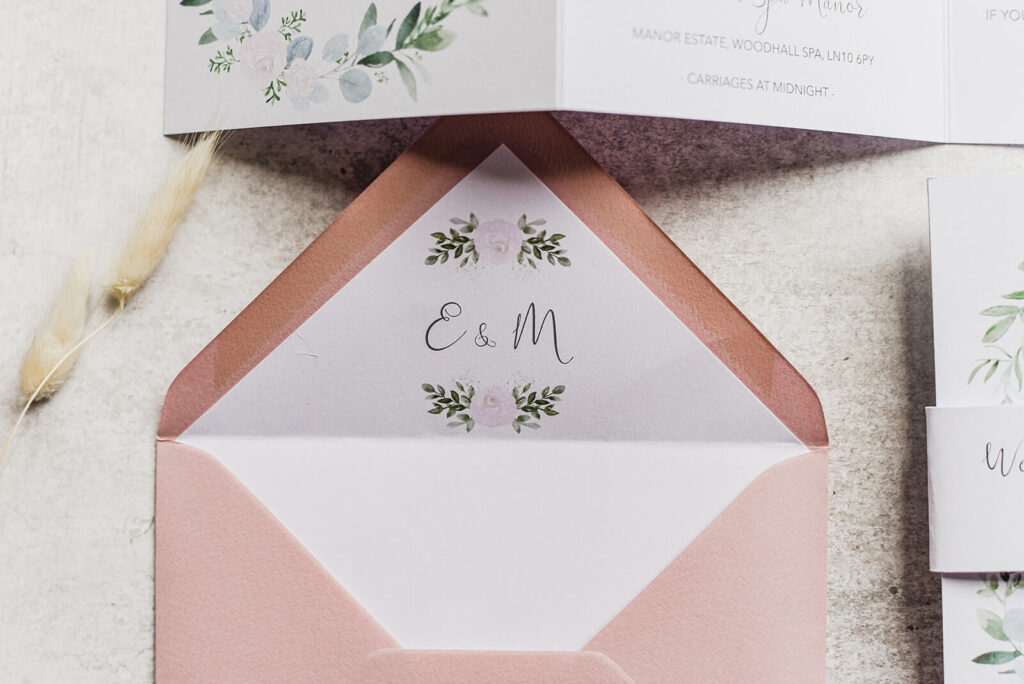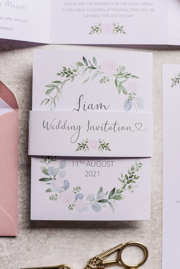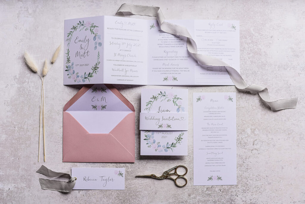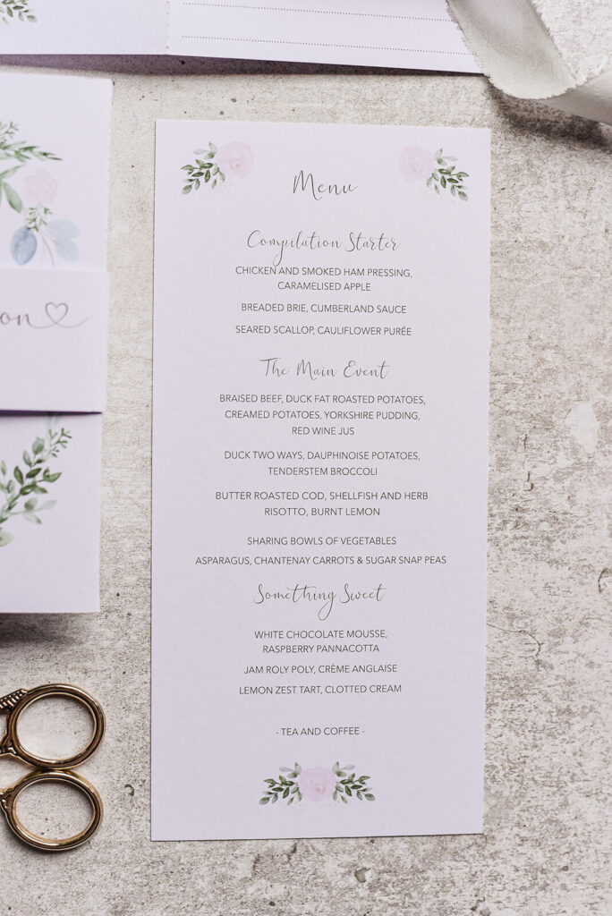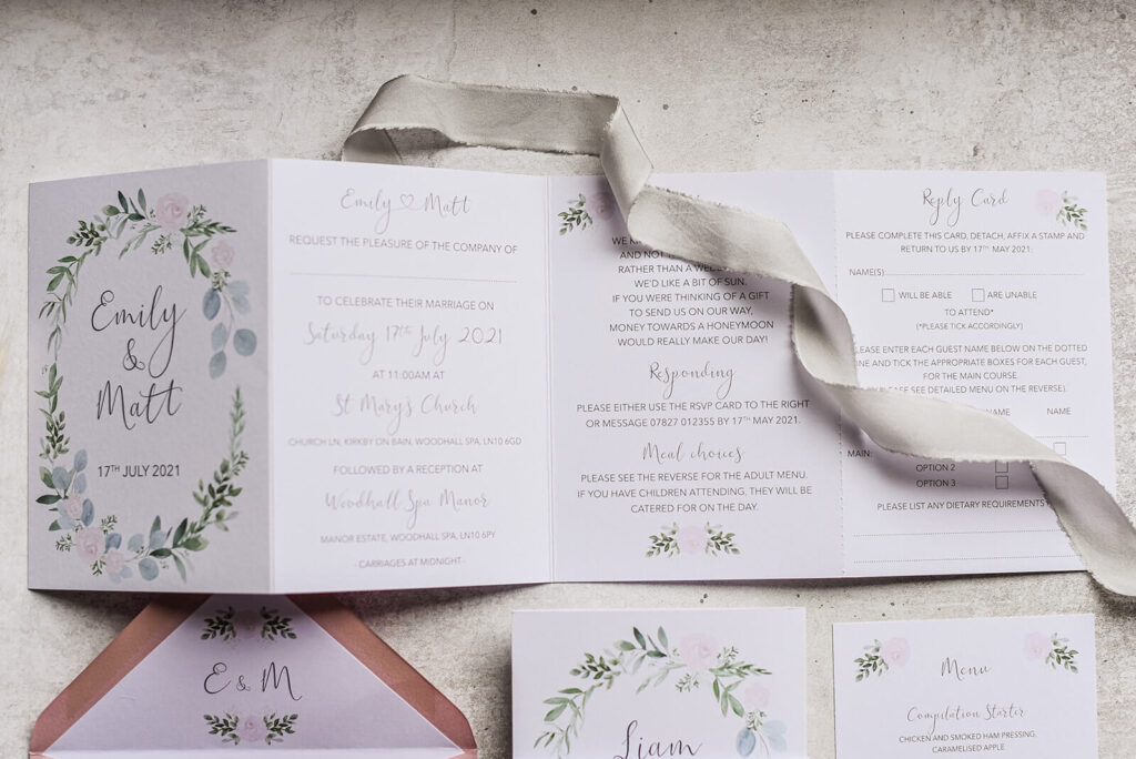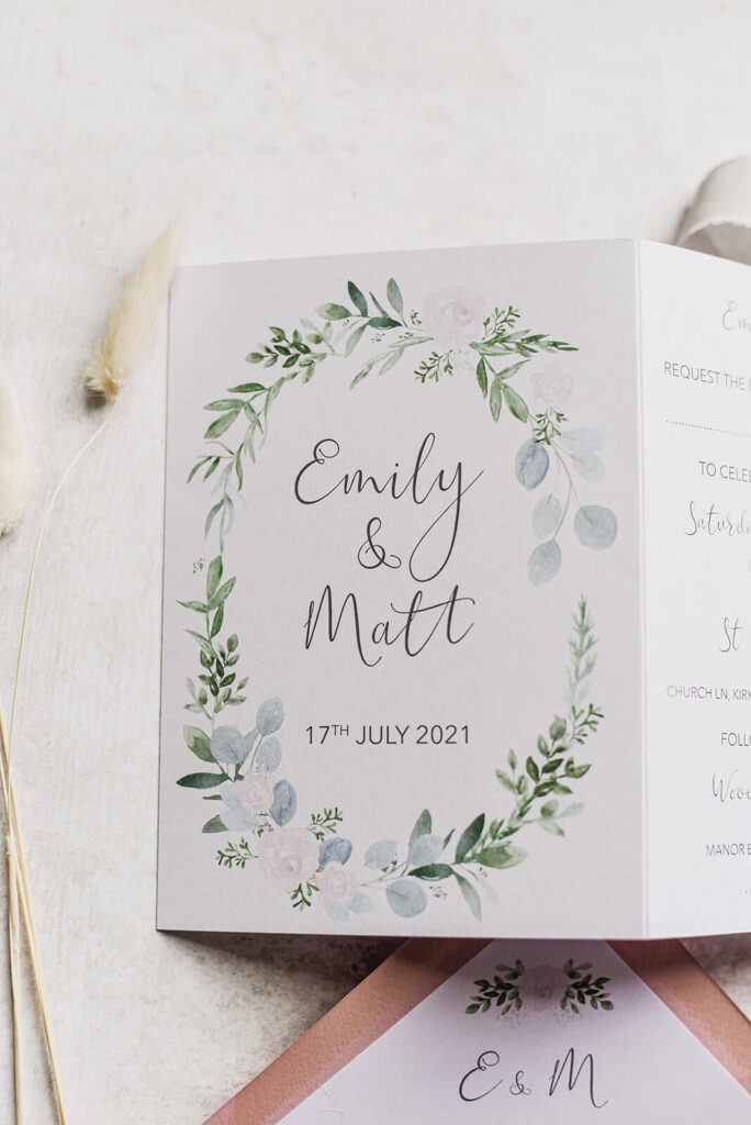 The Seville collection incorporates a gorgeous botanical wreath design with roses that can be customised to match your wedding colour scheme. This wedding stationery collection is ideal both for a floral, country garden style wedding or if you’re opting for a rustic, bohemian vibe. The main invitation in this collection is a concertina style which is perfect if you have lots of information to give your guests as it is double sided with 8 panels in total (if not all panels are required then these are filled with floral decorative elements so there will be no blank panels). The far right hand panel acts as the RSVP and has a perforated edge so that it can be easily torn off by the guest. It can also have your name and address printed on the reverse which makes it easy for your guests to reply – they just have to insert their names, tick whether they are attending, pop on a stamp and post back to you. No excuses for not responding! Matching on-the-day stationery is available ranging from place cards, seating plan, table numbers, menus, order of service – the list goes on! Colour changes to the printed text, florals and background print are available at no extra cost.